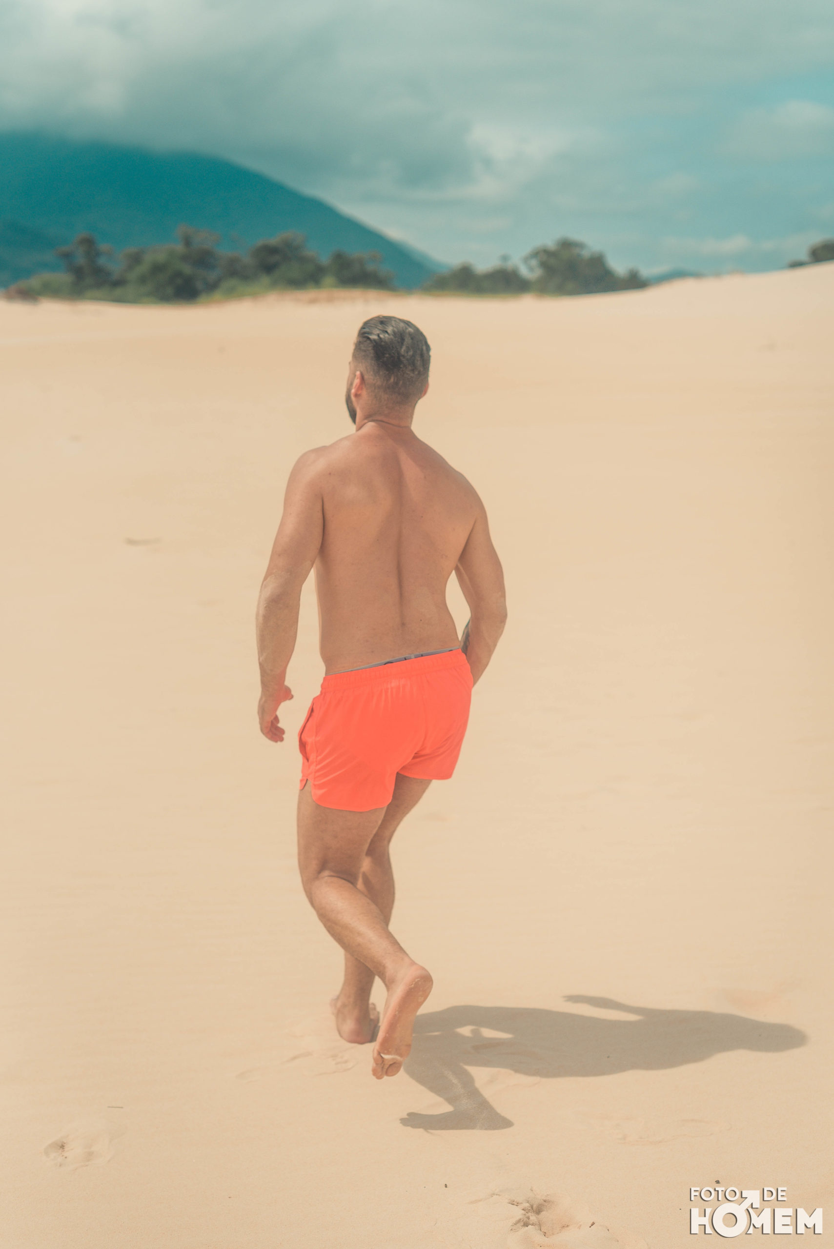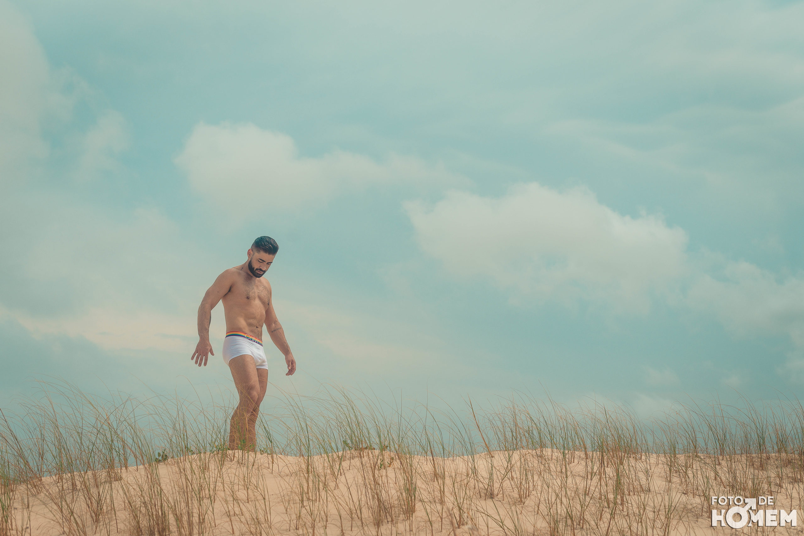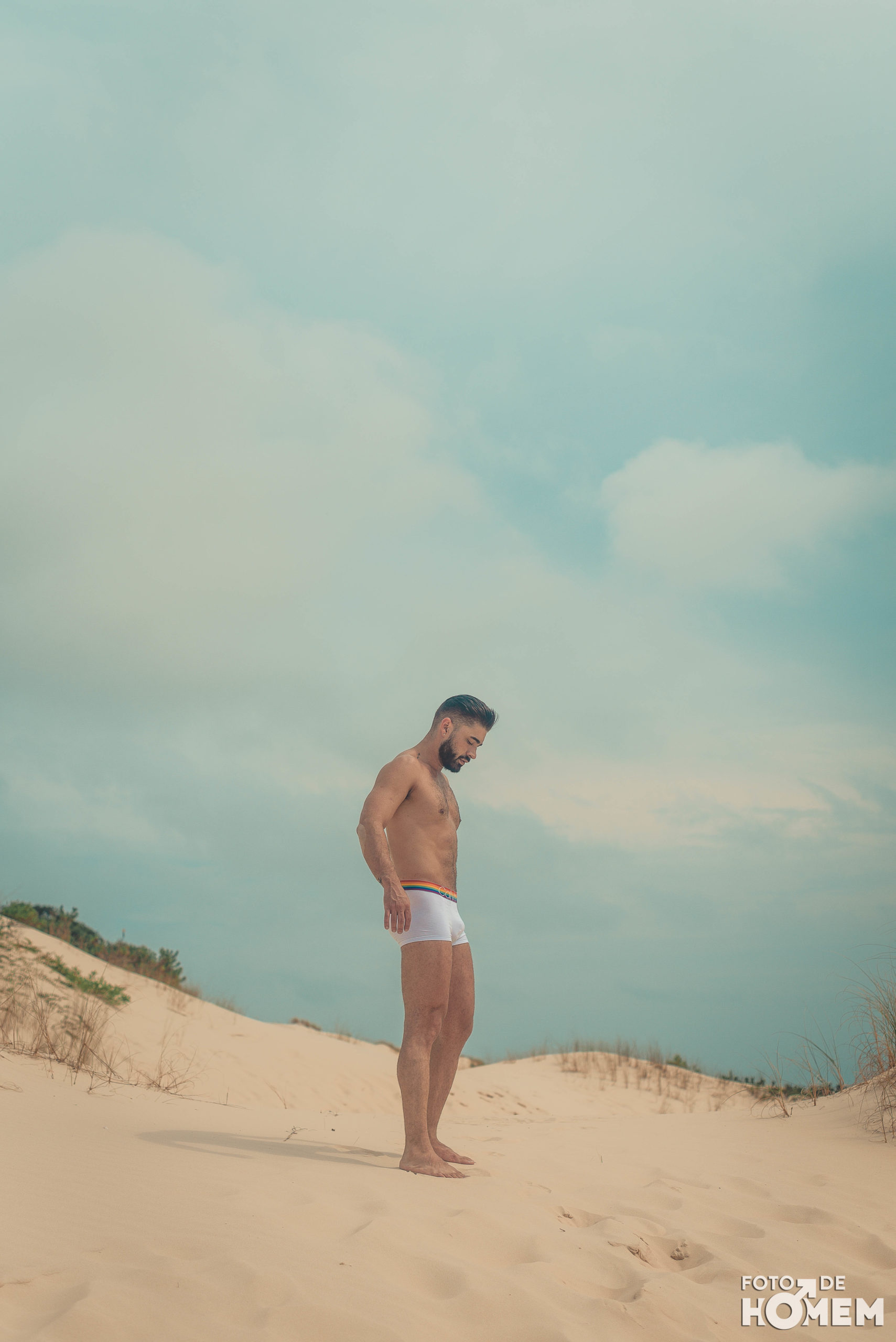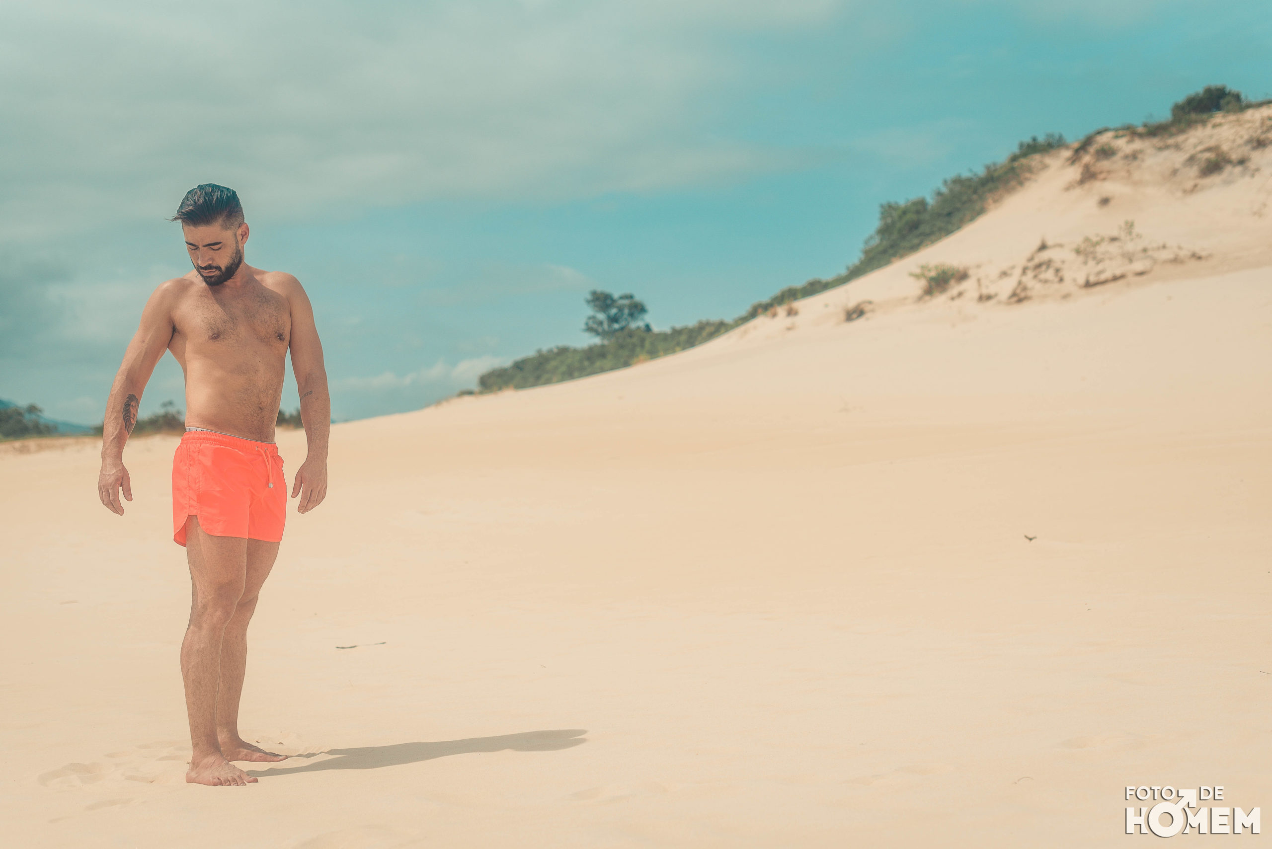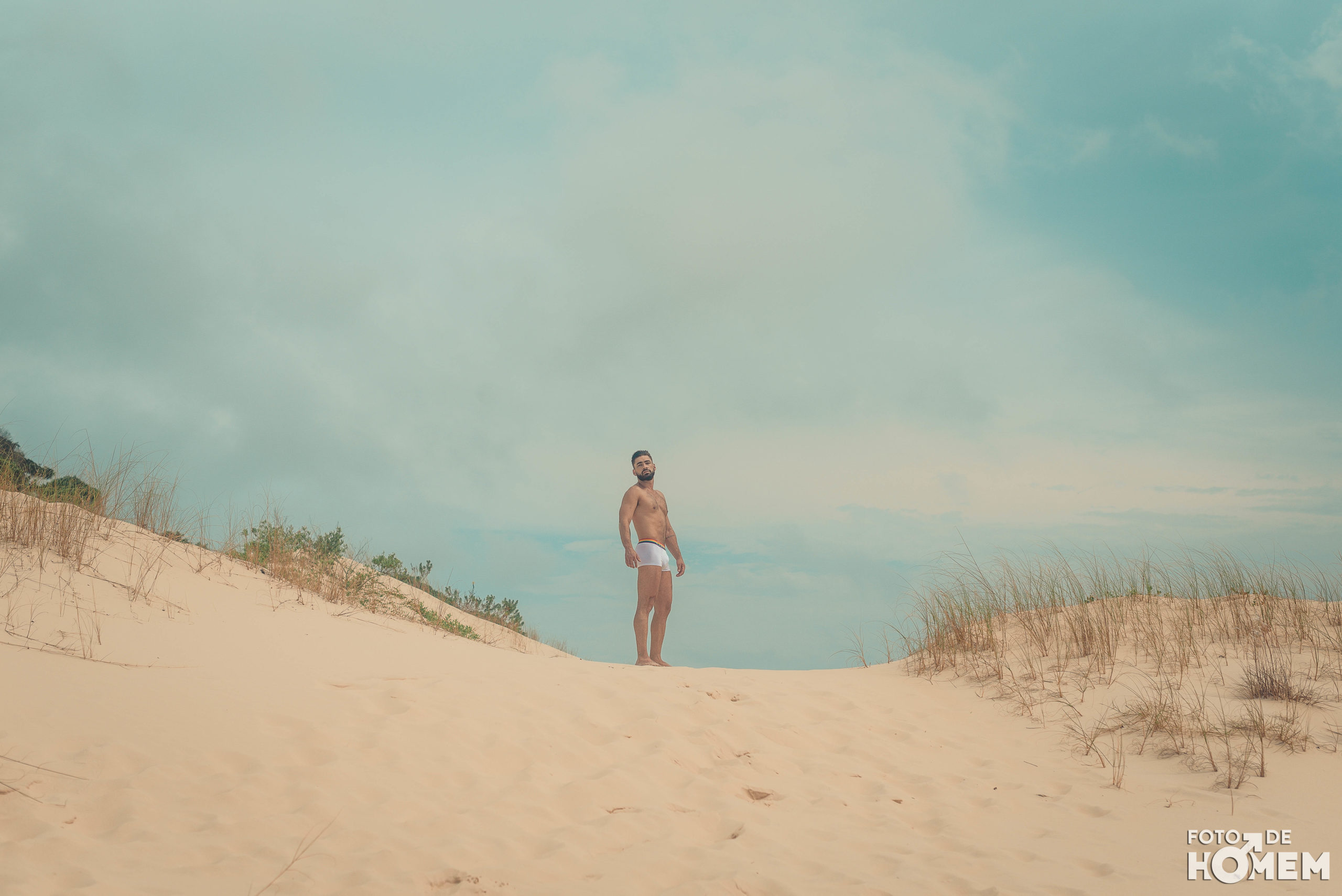 Debaixo de um Sol escaldante sobre as dunas da praia da Joaquina, em Florianópolis, fotografei o Jean nu em pelo. Os cenários são de tirar o fôlego e o modelo não teve nenhuma dificuldade em tirar a roupa.