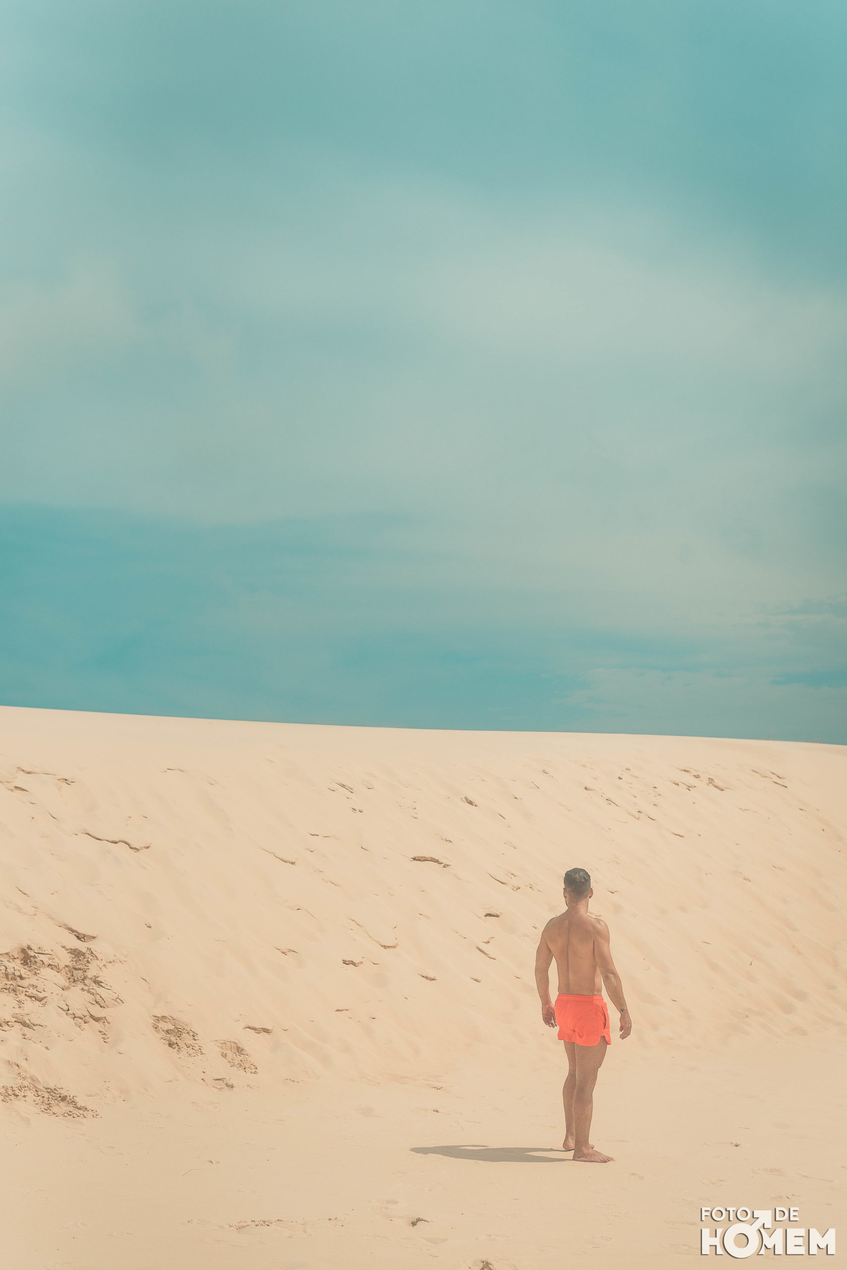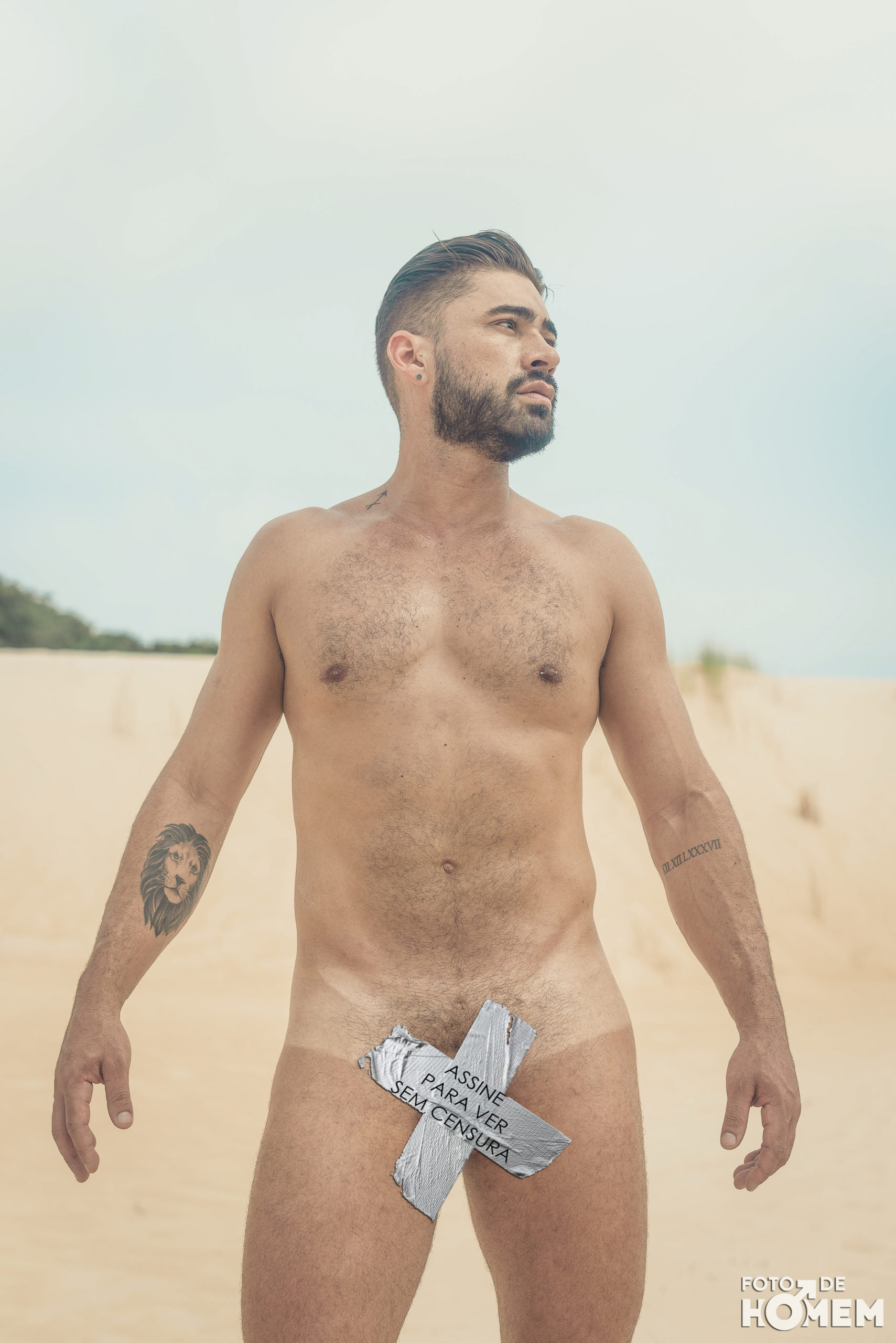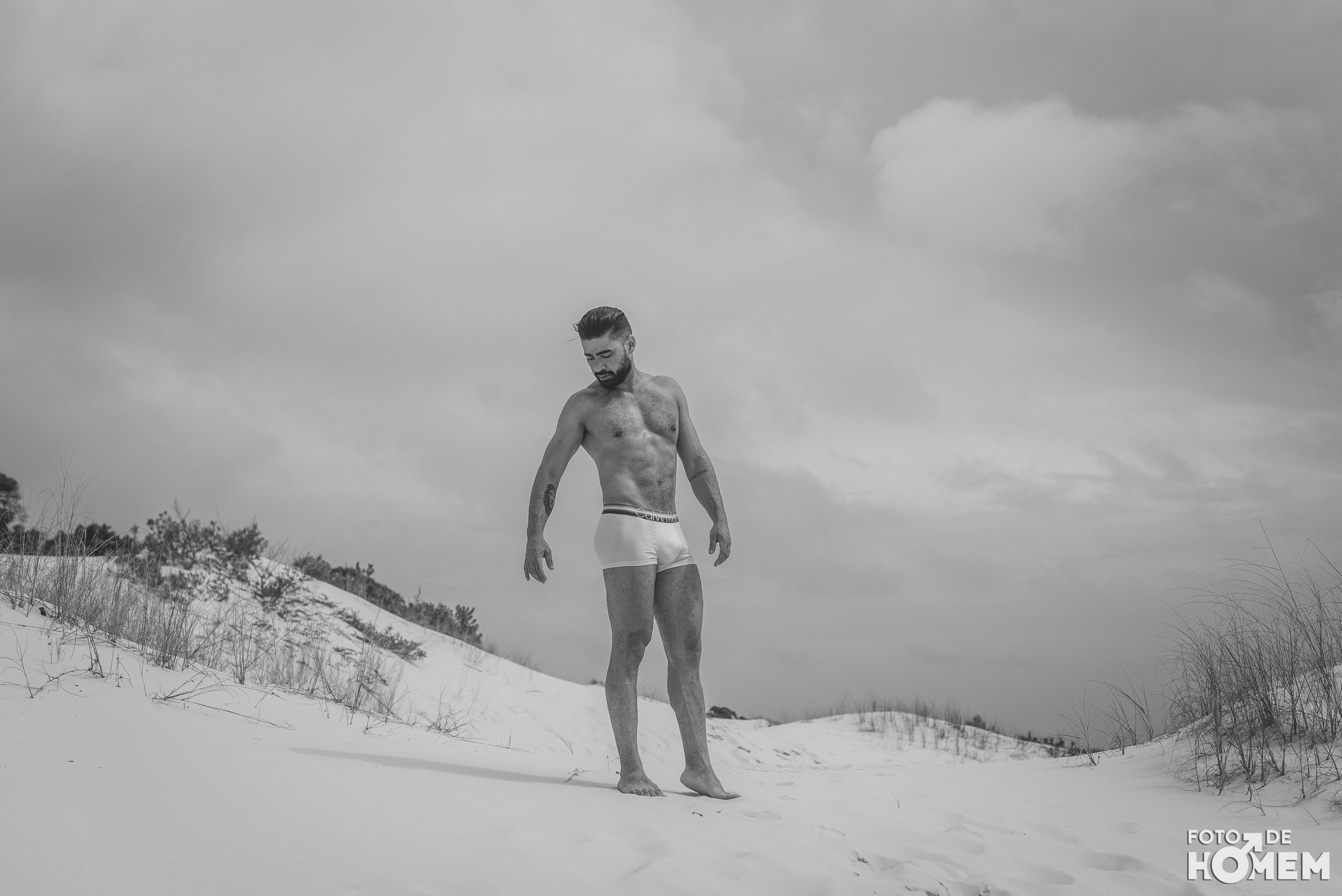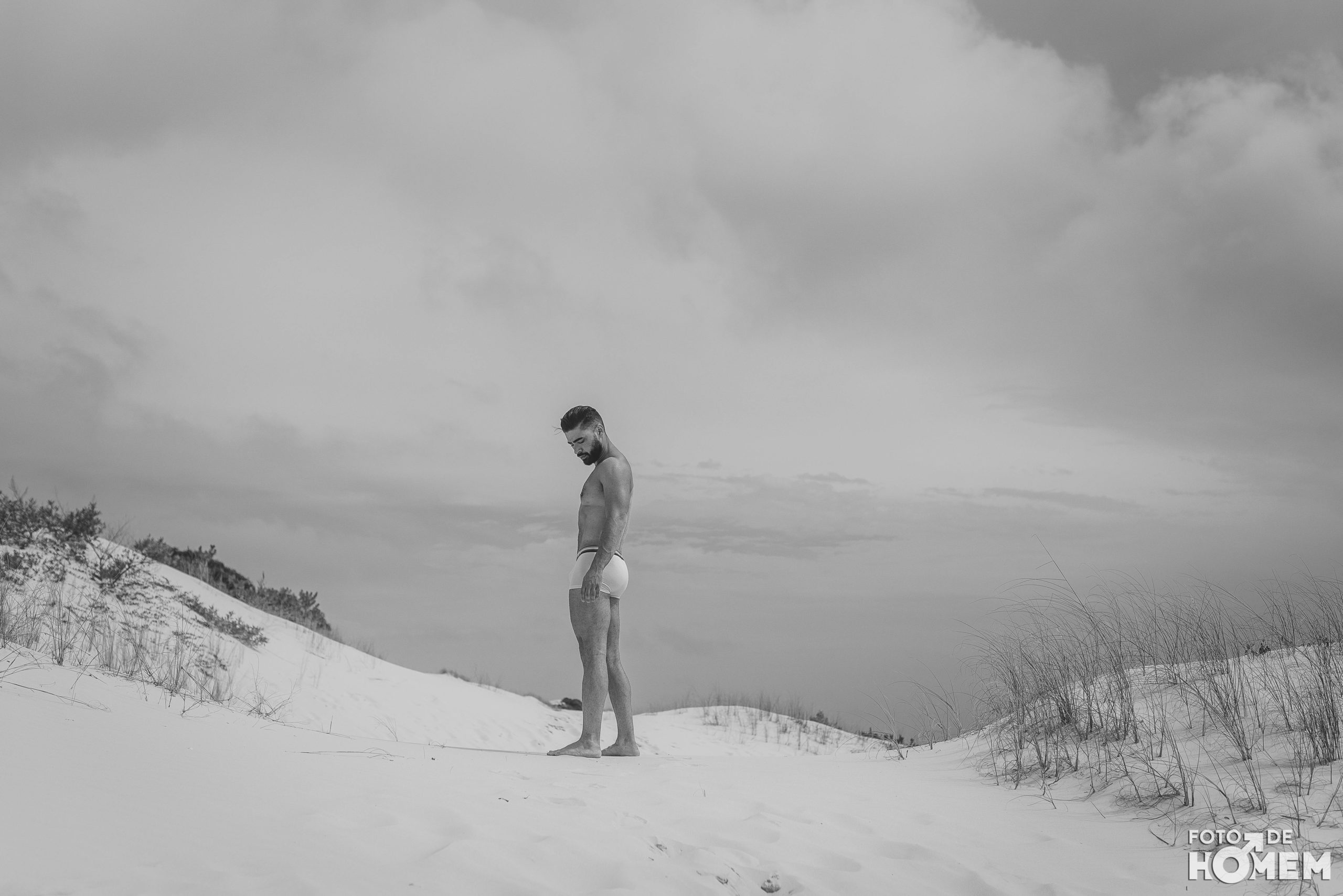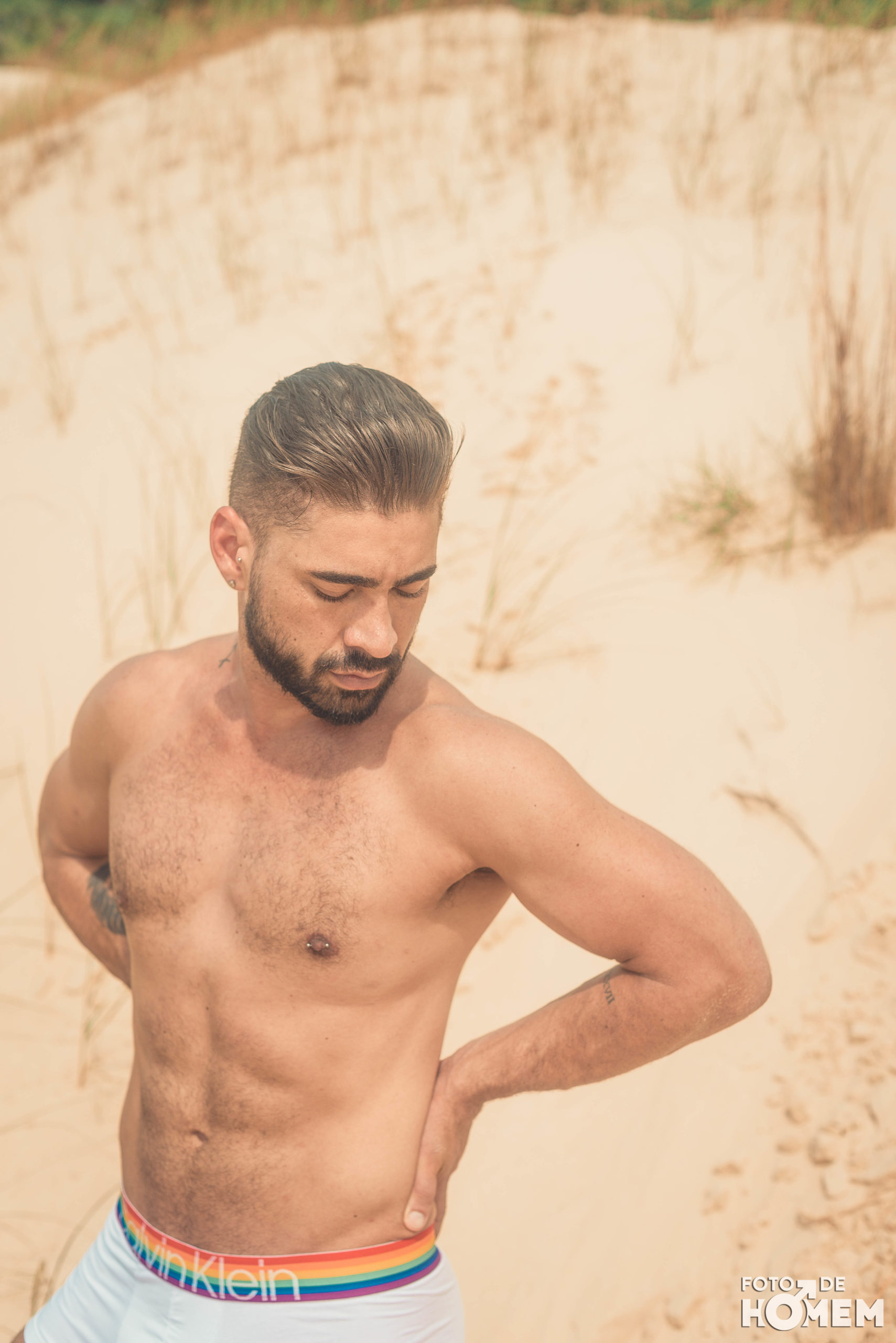Debaixo de um Sol escaldante sobre as dunas da praia da Joaquina, em Florianópolis, fotografei o Jean nu em pelo. Os cenários são de tirar o fôlego e o modelo não teve nenhuma dificuldade em tirar a roupa.