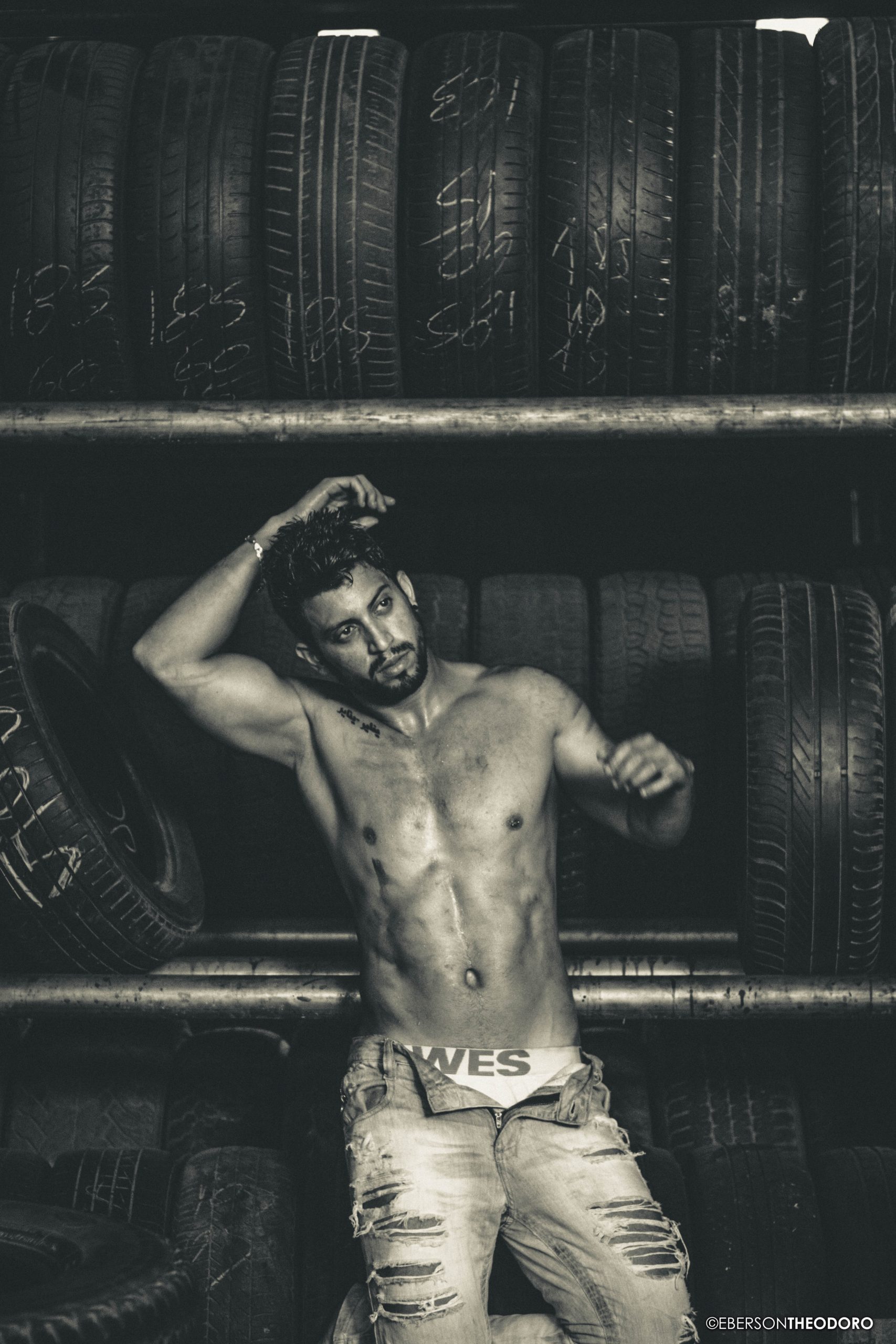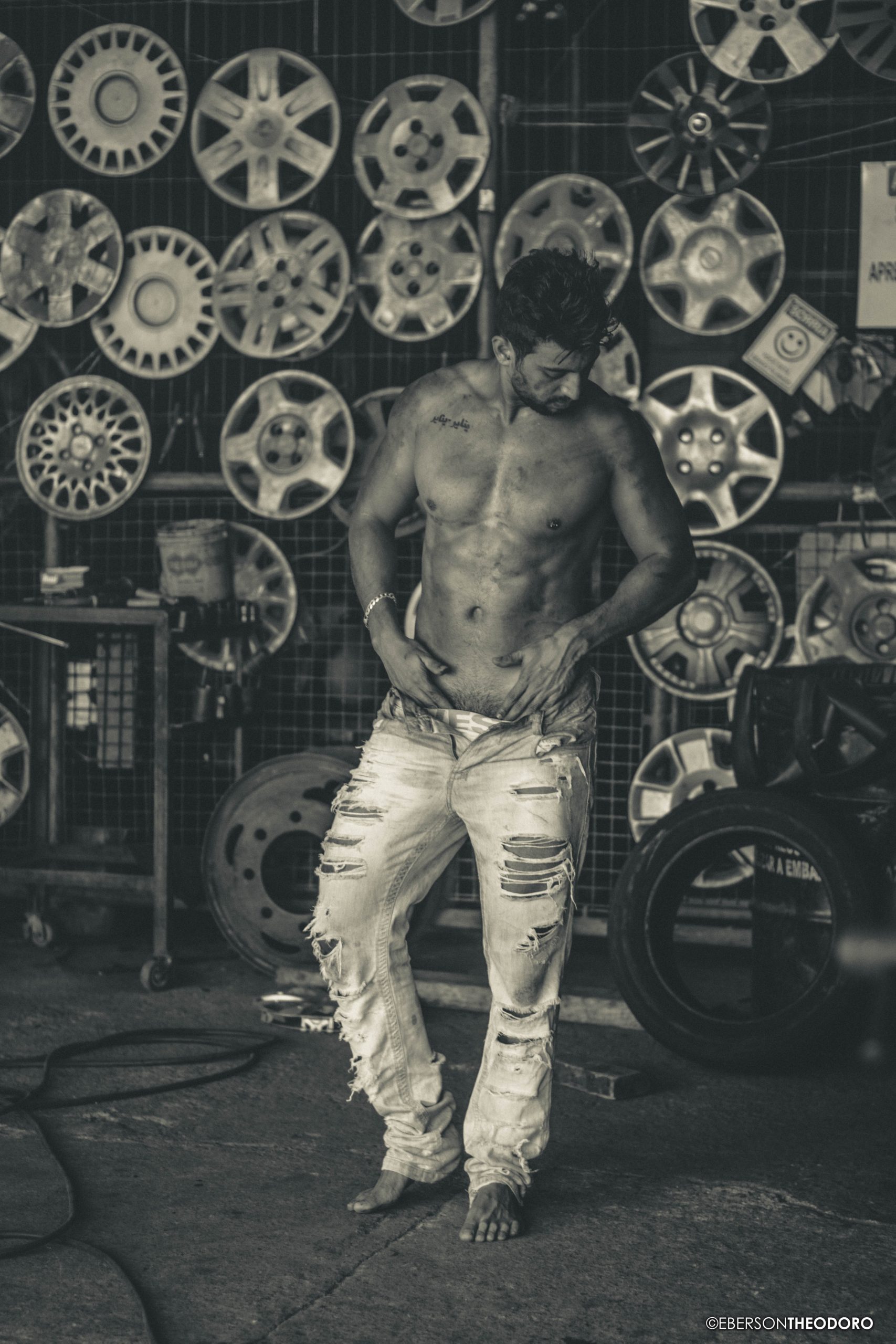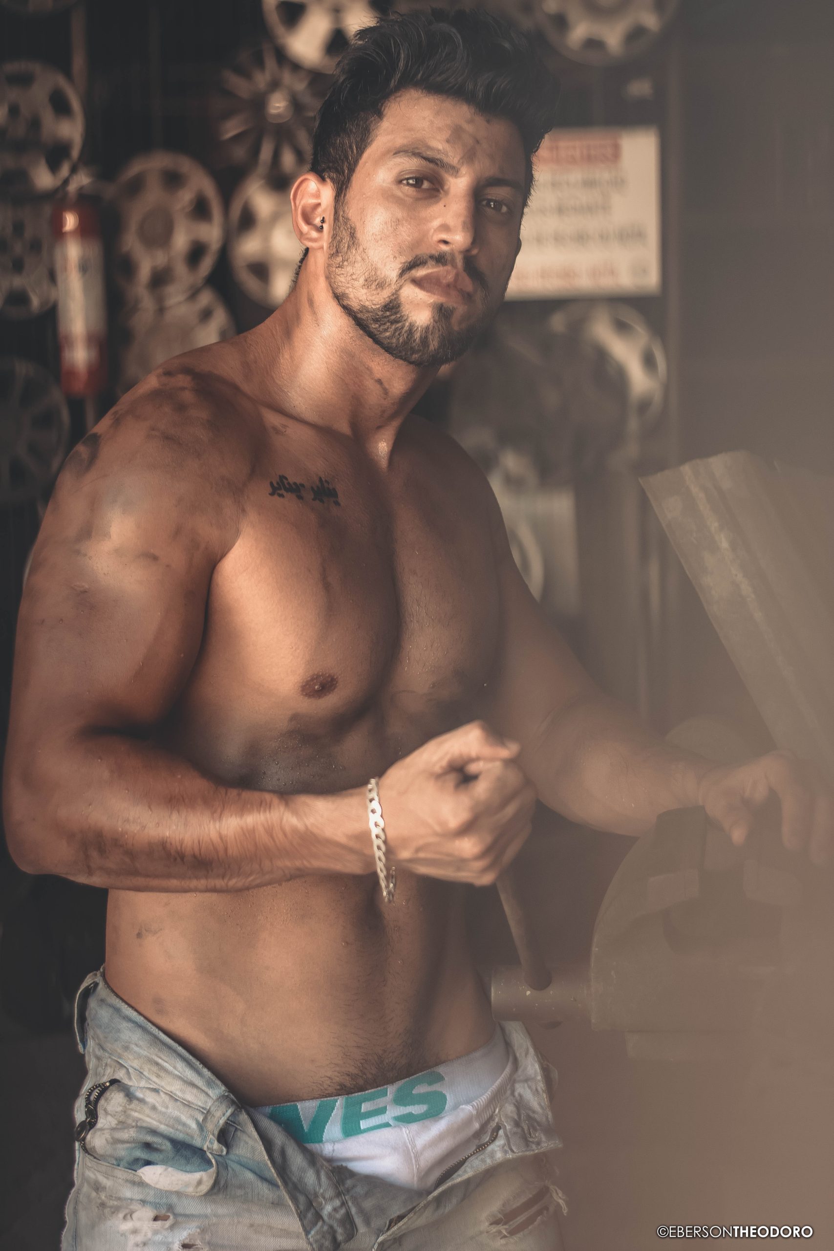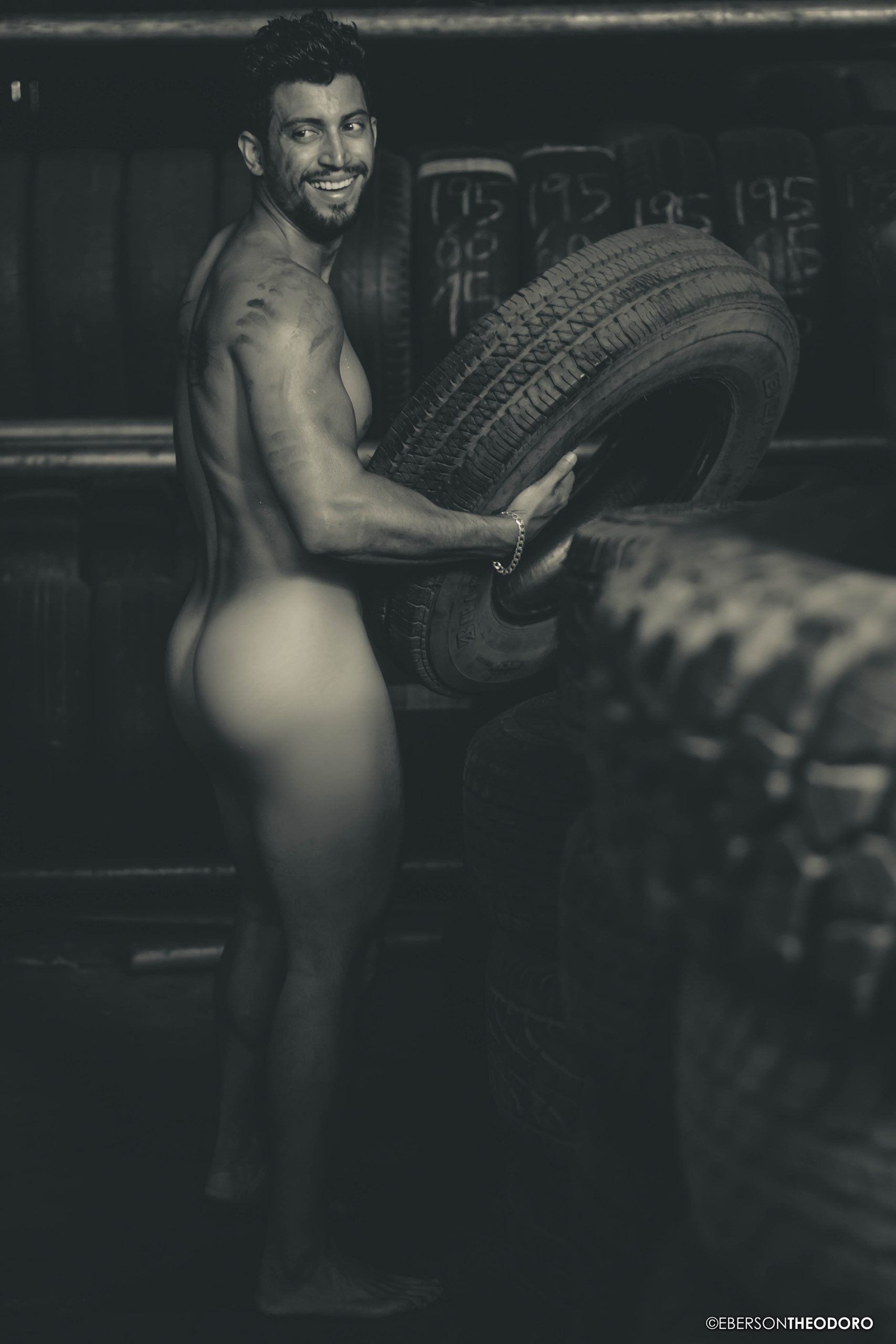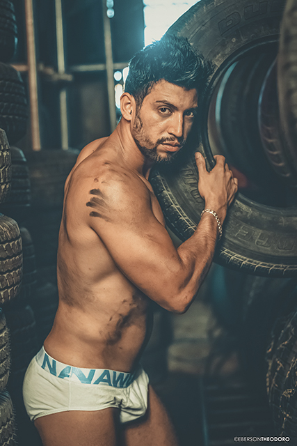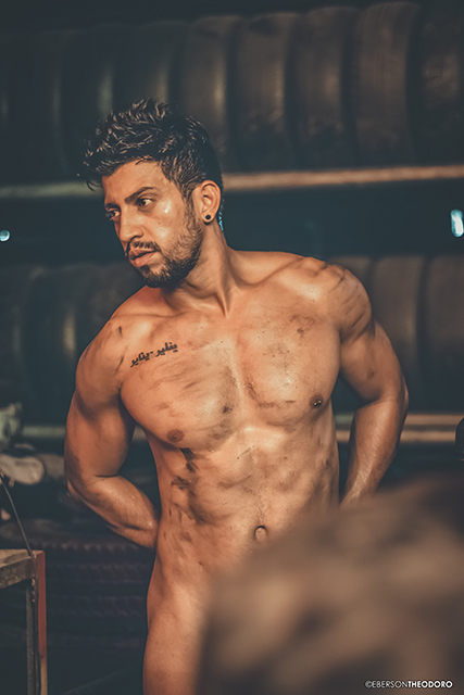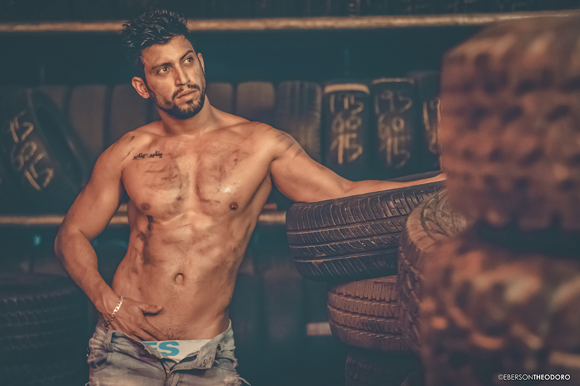 Herberty Marques, 26 anos, posou para um ensaio em 2018 dentro de uma borracharia em Joinville/SC. Com um jeans rasgado e marcas de graxa pelo corpo, ele encarnou o personagem e ficou totalmente a vontade entre pneus, ferramentas e peças de automóveis.