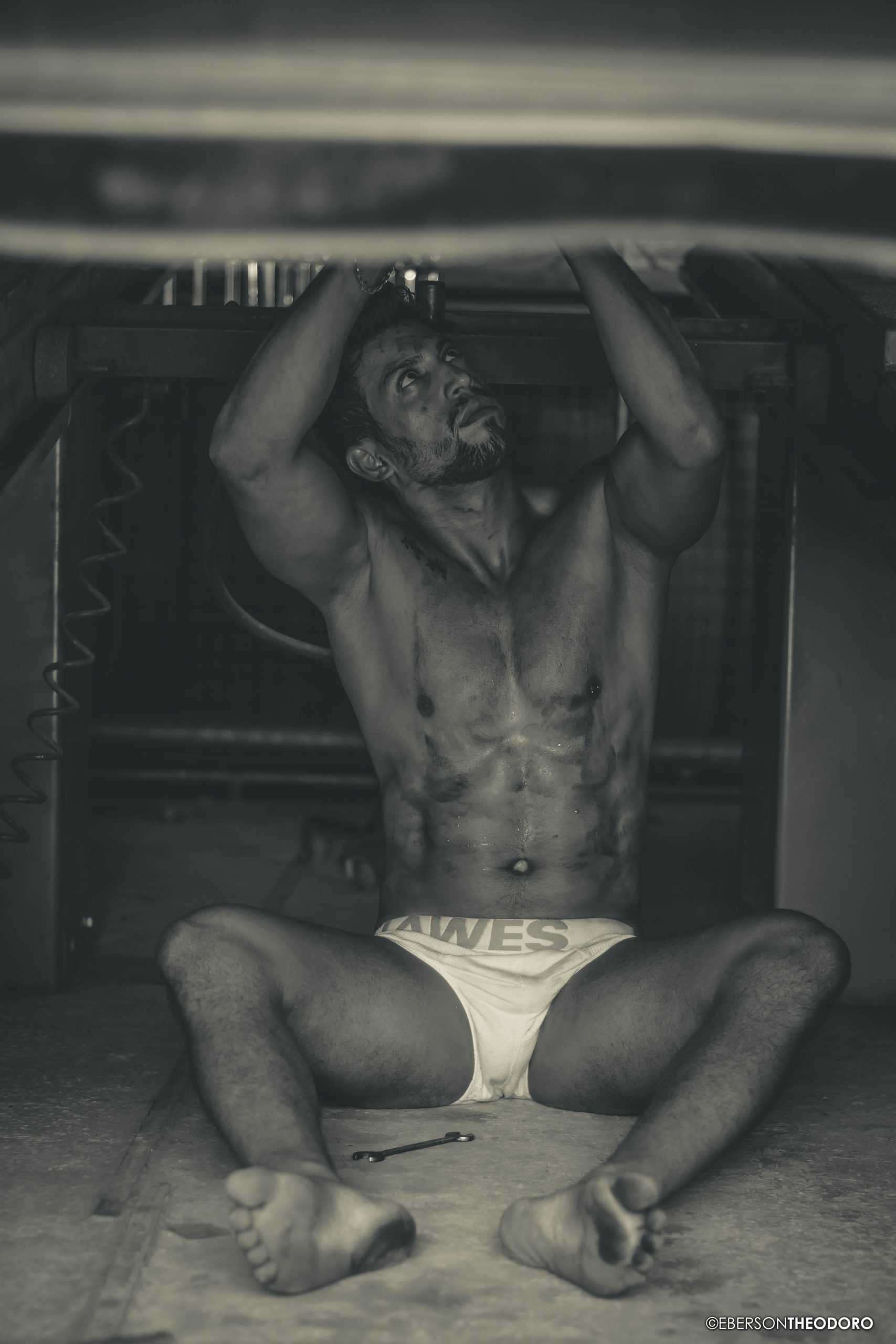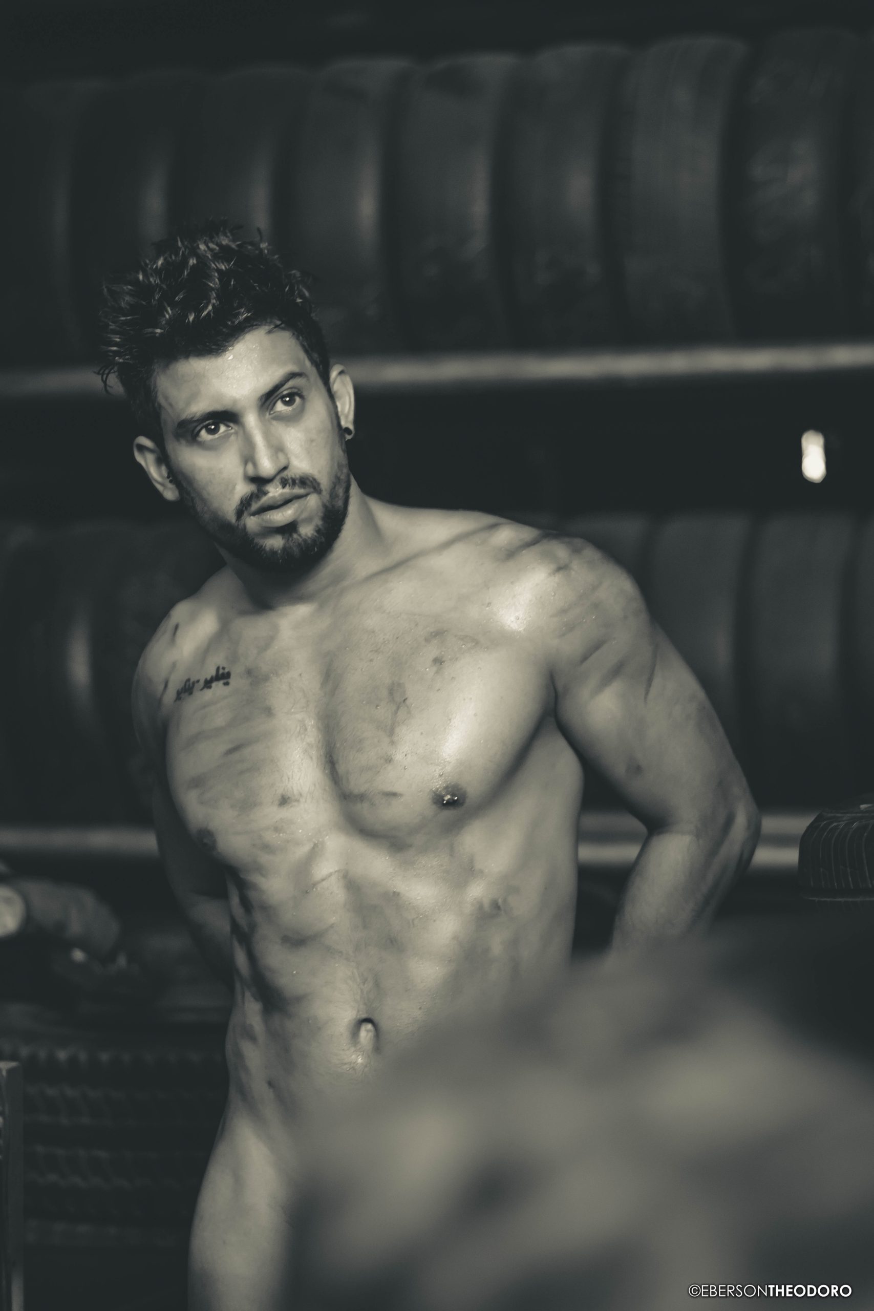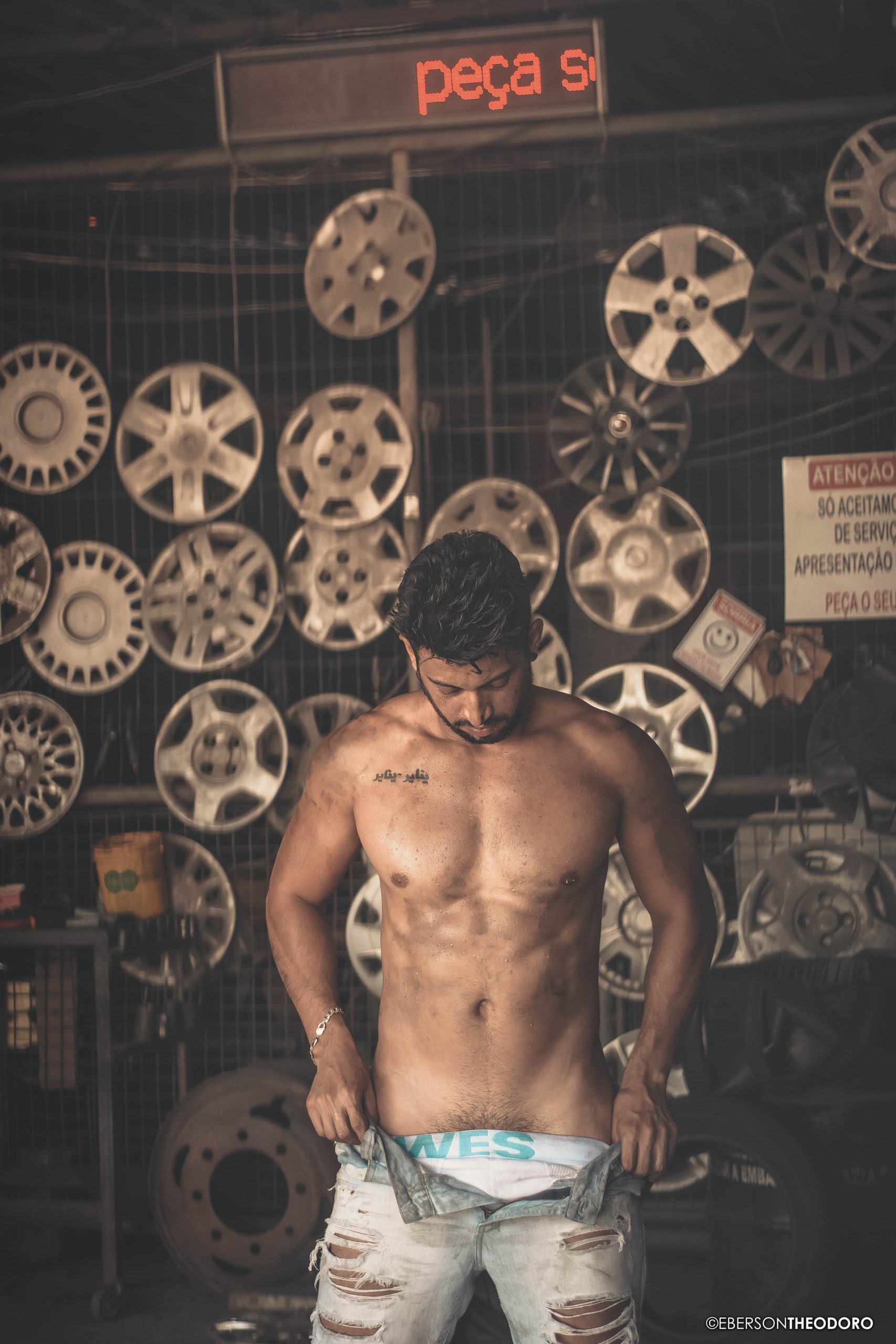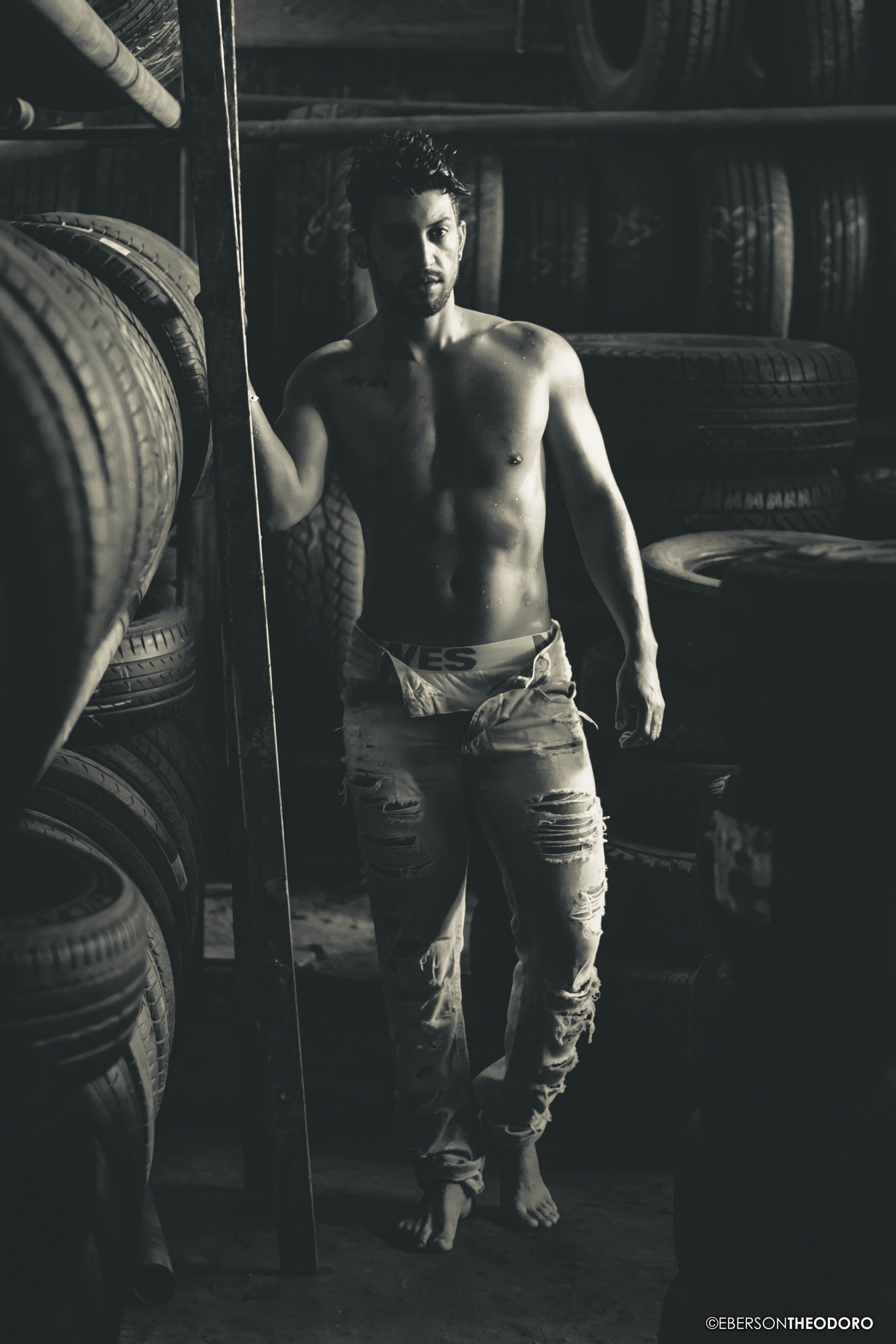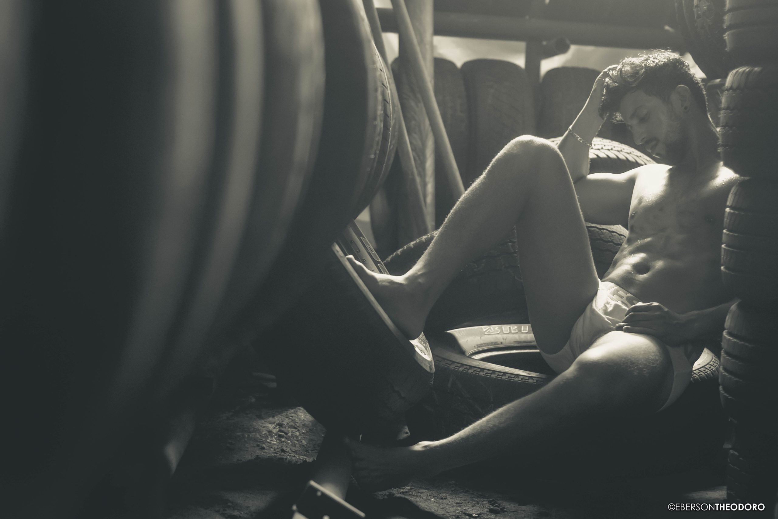 Herberty Marques, 26 anos, posou para um ensaio em 2018 dentro de uma borracharia em Joinville/SC. Com um jeans rasgado e marcas de graxa pelo corpo, ele encarnou o personagem e ficou totalmente a vontade entre pneus, ferramentas e peças de automóveis.